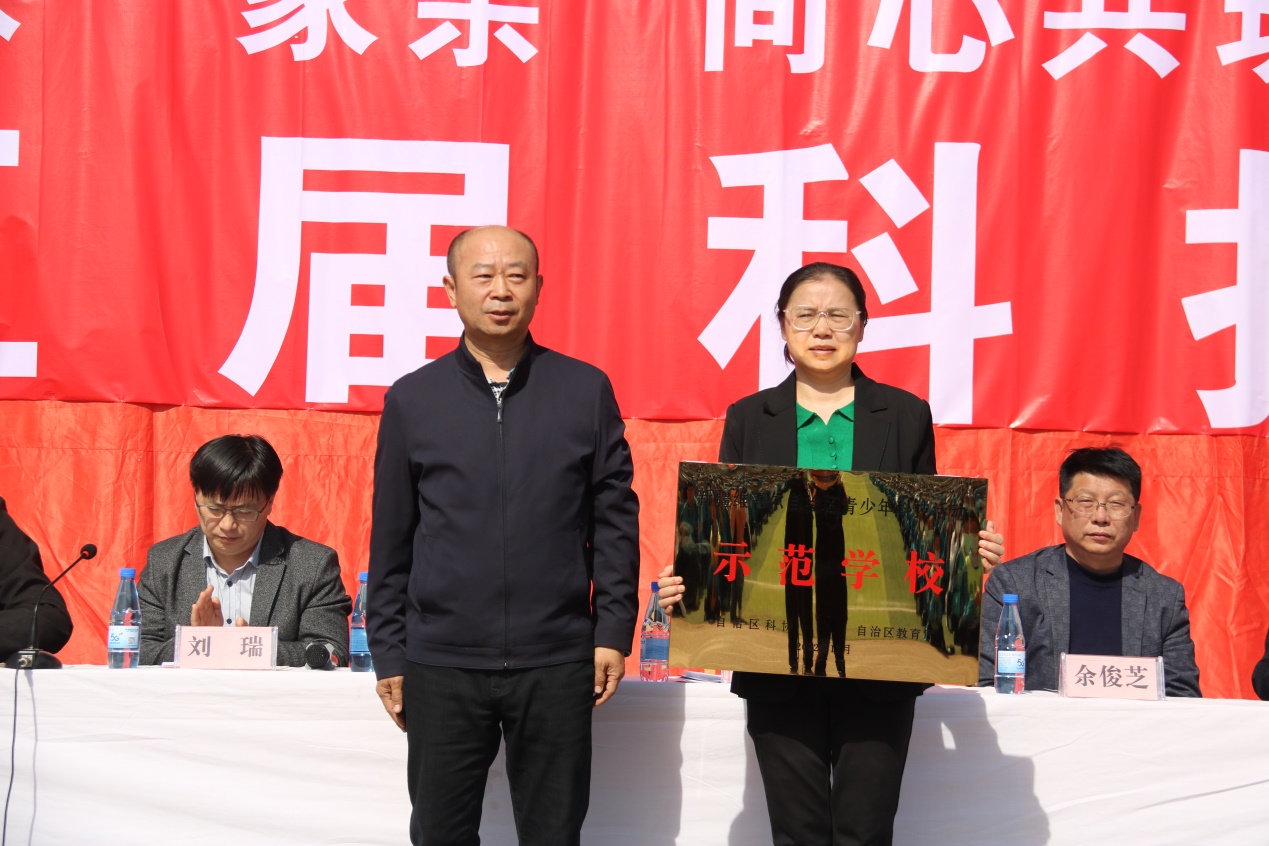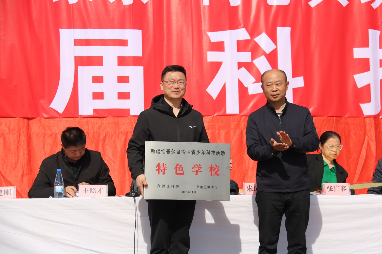 朱成強為沙灣市第一中學和沙灣市第一小學頒發(fā)2022年自治區(qū)科技特色示范學校牌匾,為沙灣一中教師、沙灣市科技輔導員宋珂平老師頒發(fā)中國科協(xié)科普部授予的2022年全國科普優(yōu)秀志愿者證書。