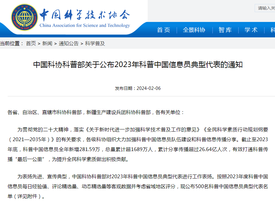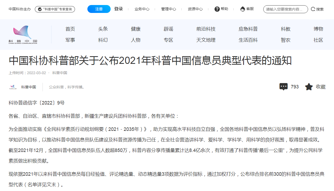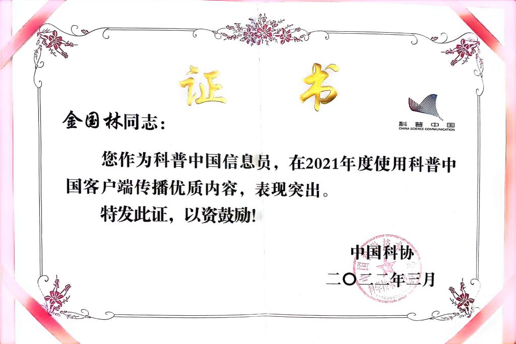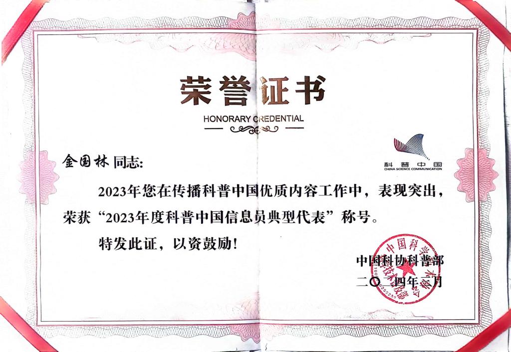 近日,中國科協(xié)科普部公布了《關(guān)于2023年科普中國信息員典型代表的通知》,阜康市科技局二級主任科員金國林同志榮獲“2023年科普中國信息員典型代表”稱號,這是該同志繼獲得“2021年科普中國信息員典型代表”后再次受到中科協(xié)的表揚。