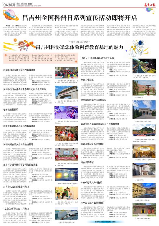 為向群眾展示科普教育基地的獨特魅力,進一步擴大科普教育基地影響力,將科普教育資源作用最大化,昌吉州科協近日推出全國科普日系列活動之科普教育基地集中展示,選取了昌吉州16家自治區級和州級科普教育基地,通過昌吉州人民政府網、昌吉日報及昌吉州科協微信公眾號等昌吉州多家官方媒體,以圖文并茂的形式,對這些科普教育基地進行集中展示宣傳,向公眾詳細介紹了基地的類型、特點等,并公布了地址、開放時間及預約電話等服務信息,方便群眾預約參觀,號召大家前去打卡。