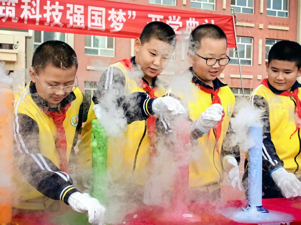 科學實驗環節,博樂市科協工作人員和科學老師用通俗易懂的語言介紹干冰原理,并現場制作精彩的干冰秀,如夢如幻的彩虹瀑布令人驚嘆。隨后的“西游記大鬧天宮”表演更是將現場氣氛推向高潮,為同學們帶來一場充滿趣味的科學盛宴,生動展現傳統文化與現代科技的完美結合。