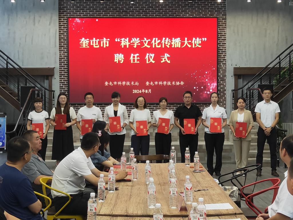 為調(diào)動廣大科技工作者更加積極投身我市科普事業(yè),進一步壯大科普志愿者隊伍,8月1日上午,奎屯市科協(xié)、市科技局聯(lián)合舉辦科學文化傳播大使集中聘任儀式,活動現(xiàn)場公布了24位來自社會各界的科學文化傳播大使名單,市科協(xié)、科技局領(lǐng)導分別為24位市科學文化傳播大使頒發(fā)了聘書。