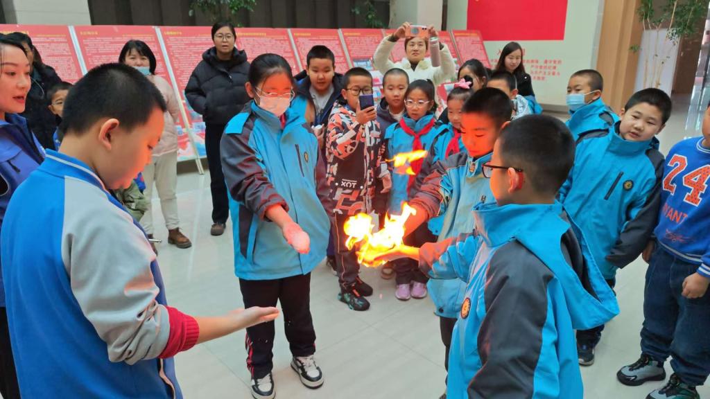 在參觀結束后,同學們在科技輔導員的帶領下,有序排列在一樓活動大廳等待,隨后科技輔導員給大家展示“火焰掌”“水的張力”等小實驗,帶大家感受科學的神奇之處。