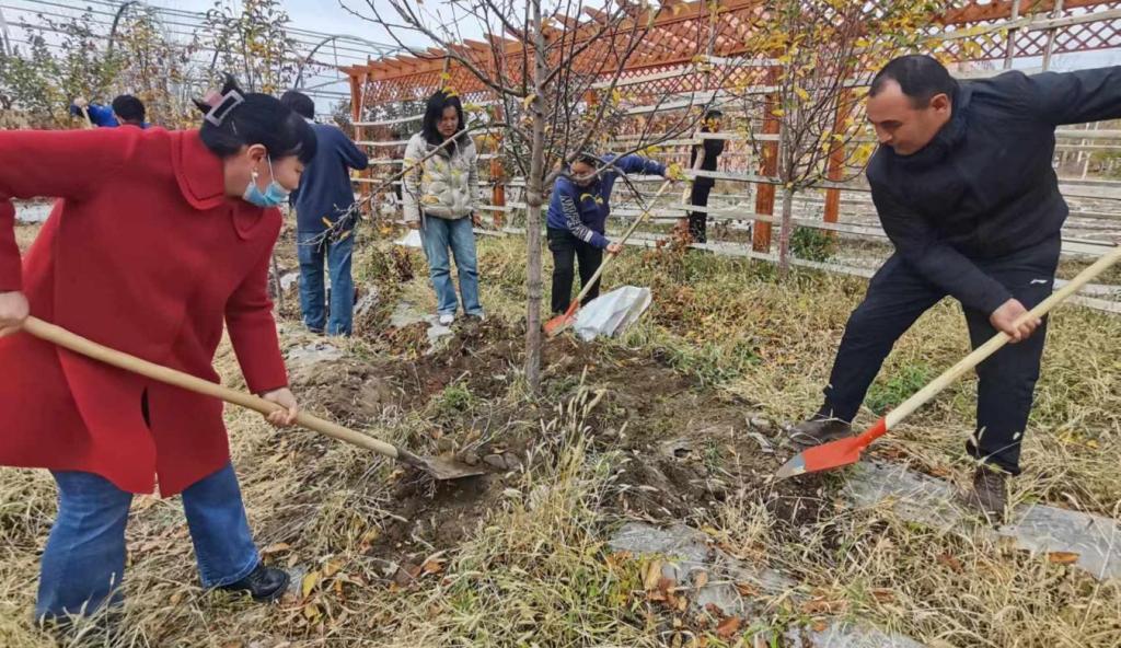 來到克孜勒希力克鄉,鄉政府早已組織好包村干部們。在技術專家的示范下,村干部們一起學習如何給蘋果、李子、海棠施肥,挖施肥溝的寬度、深度及施肥量、墊土厚度等以及葡萄的修剪方法、施肥和埋土、澆冬灌水等措施。