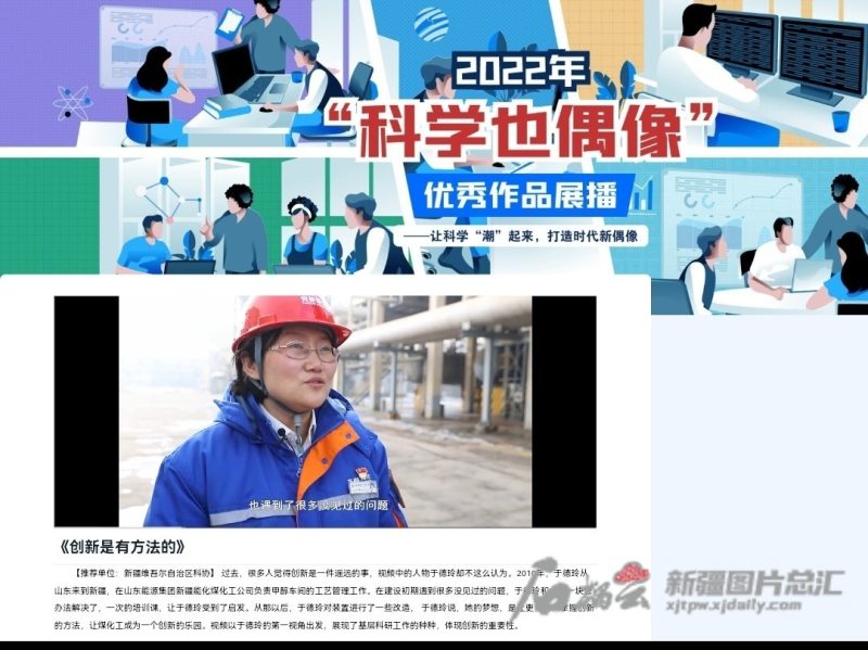 新疆5部獲獎作品包括:中國石油新疆油田公司勘探開發研究院趙龍作品《滾滾油流涓涓愛——覃建華科技報國事跡短片》(二等獎);新疆氣象學會、新疆氣象服務中心伊力哈木作品《綠色生態工匠——毛煒嶧》(三等獎);新疆植物學會康曉珊作品《科研工作者的生命永遠年輕》 、新疆維吾爾自治區中藥民族藥研究所趙亞琴作品《邊疆中藥人——李曉瑾團隊》、山東能源集團新疆能化公司李響作品《創新是有方法的》(優秀視頻)。