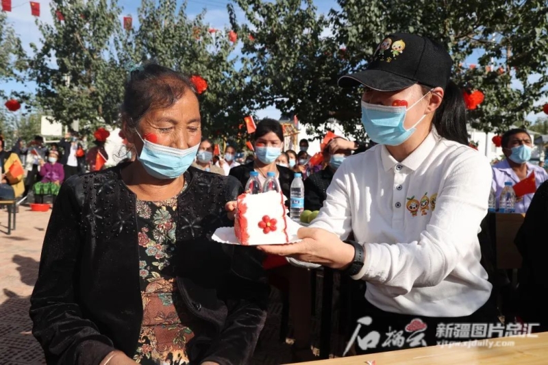 10月1日,烏什縣阿恰塔格鄉托克遜鐵提爾村,為慶祝中華人民共和國成立73周年,結對認親干部和各族群眾一起切蛋糕,歡度節日。外力·克依木攝