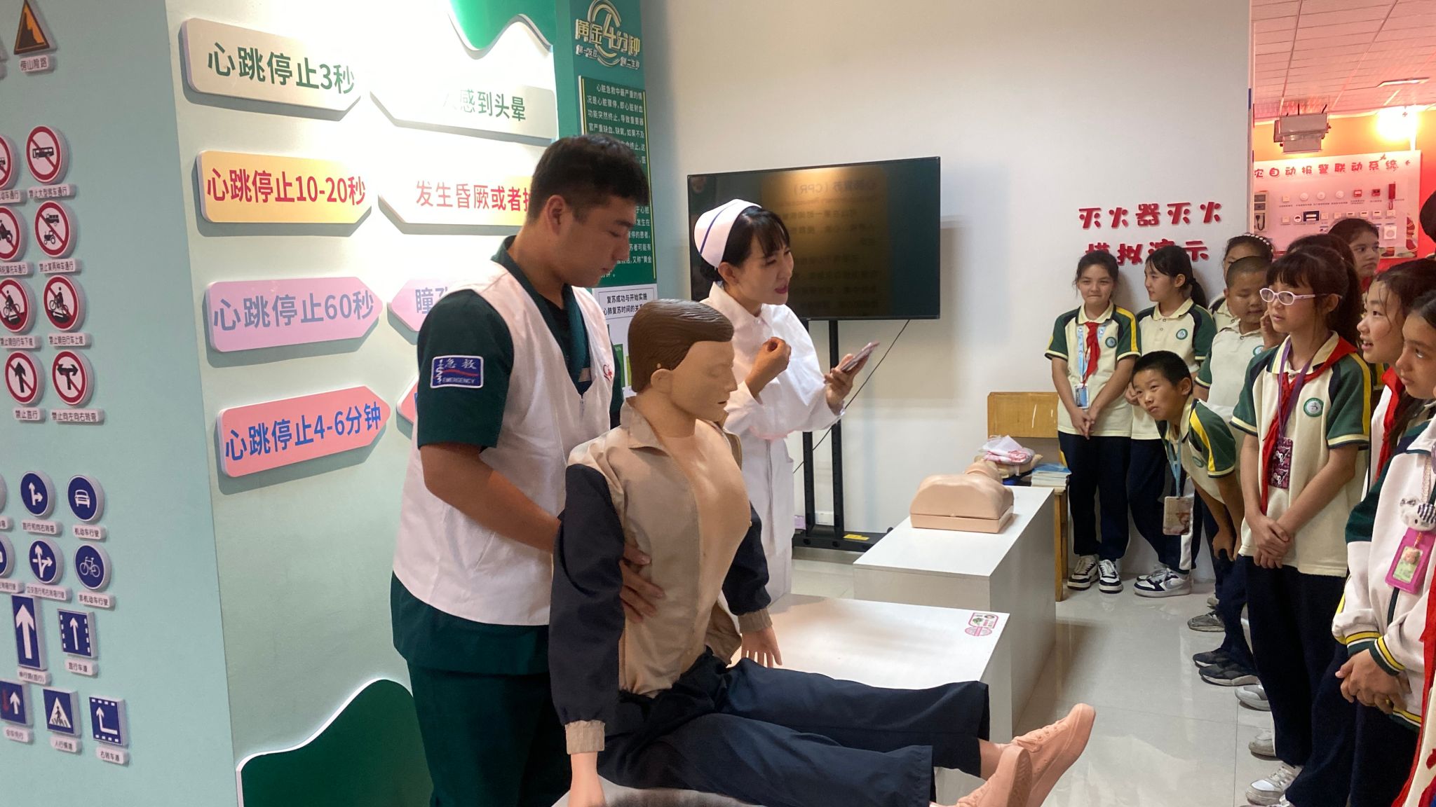 本次活動在塔城市科技館開展,邀請塔城市第五小學五年級三班學生參加。活動現場,專業講師圍繞心肺復蘇、海姆立克急救法等基礎急救知識展開講解,重點介紹了“黃金四分鐘”的重要性,還結合心臟驟停不同時間人體反應等生動案例,讓學生們直觀了解急救要點。