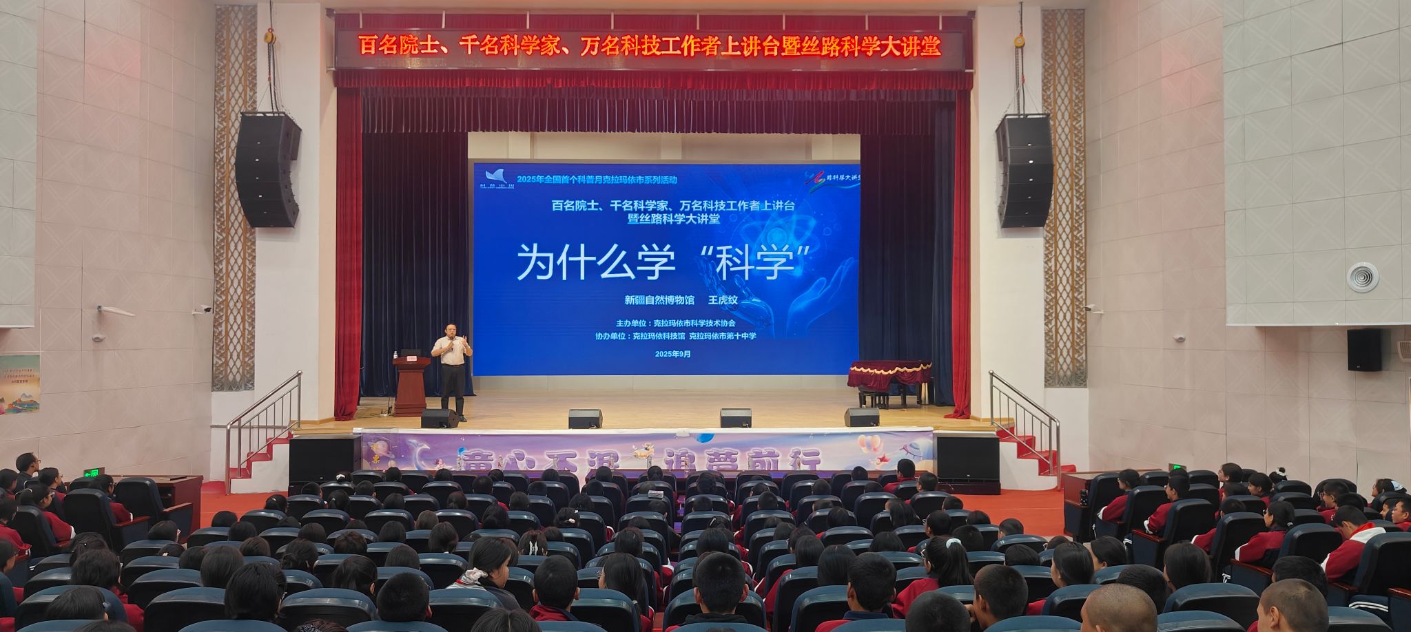 9月25日,克拉瑪依市科協特邀新疆自然博物館副館長王虎紋走進市第十中學,為400余名初二學生帶來一場題為《為什么學“科學”》的精彩專題講座。