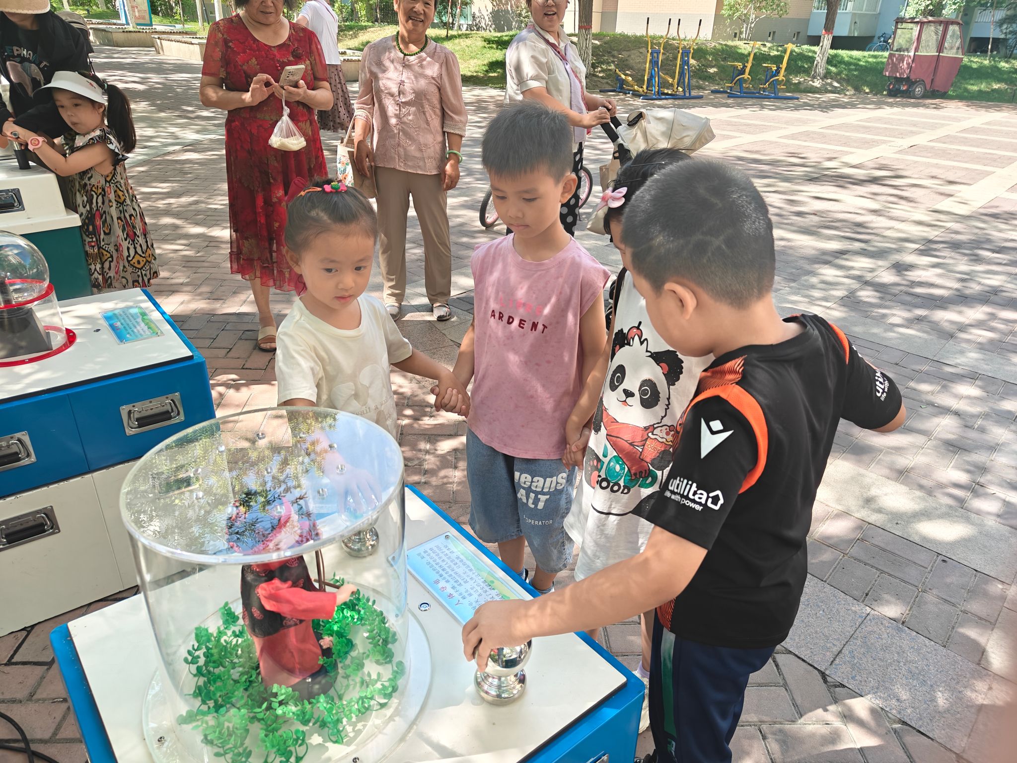 7月9日,科普大篷車開進博雅馨園小區廣場,現場的小朋友們手拉手,體驗“人體導電”設備