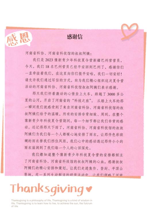 “我們不知道怎樣更好的表達我們的感動之情,只能通過這封信,再次感謝河南省科協、河南省科技館的叔叔阿姨,是你們將一場科技之旅變成了‘行走的課堂’。近日,巴州18名青少年科技夏令營營員向河南省科協、河南省科技館寄出一封誠摯的感謝信。