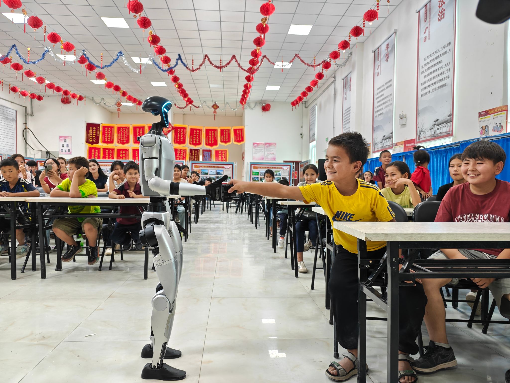 在且末縣托格拉克鄉(xiāng)蘭干村葡萄棚的綠蔭下,歡樂(lè)的笑聲此起彼伏。兩只機(jī)器狗隨著音樂(lè)節(jié)拍,整齊地做出招手、飛吻甚至利落地前空翻,孩子們“哇”聲一片,眼中滿(mǎn)是驚喜。隨后的倒立行走表演,更讓孩子們目不轉(zhuǎn)睛,眸中仿佛有星光閃爍。