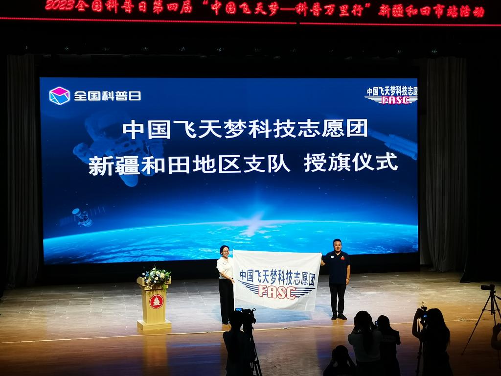 9月14日,2023全國科普日第四屆“中國飛天夢 科普萬里行”走進(jìn)和田市北京海淀小學(xué),本屆活動,途經(jīng)全國6個省57個縣市,和田市站是本屆活動的第33站。本次活動由中國科協(xié)指導(dǎo),中國飛天夢科技志愿團(tuán)、中國教育發(fā)展基金會、北京市飛行者航空科普促進(jìn)中心、北京國盛航空航天科技發(fā)展研究院共同主辦,新疆科協(xié)、和田市人民政府、和田地區(qū)科學(xué)技術(shù)協(xié)會、和田市科協(xié)、和田市教育局、和田市北京海淀小學(xué)承辦的2023年全國科普日啟動儀式暨第四屆“中國飛天夢——科普萬里行”新疆和田站活動在和田市北京海淀小學(xué)舉行,現(xiàn)場500余名師生參加此次活動。活動現(xiàn)場,中國飛天夢科技志愿團(tuán)團(tuán)長李俊天同志向和田地區(qū)支隊授旗,志愿者代表上臺宣誓,加入中國飛天夢科技志愿團(tuán)。啟動儀式上,和田市人民政府副市長巴圖爾·阿卜杜拉致詞。